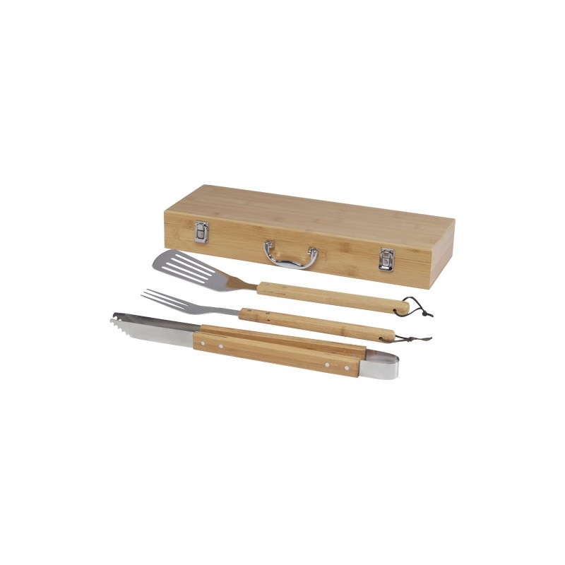 Set da barbecue in bambù composto da 3 pezzi: spatola (42 x 9,5 cm), pinza (46 x 2,2 cm) e forchettone (43 x 3,2 cm). Il set viene consegnato in una confezione regalo in bambù (51,5 x 18,2 x 7,2 cm). I manici e la confezione regalo sono realizzati in bambù ottenuto e prodotto in base a standard ecosostenibili.