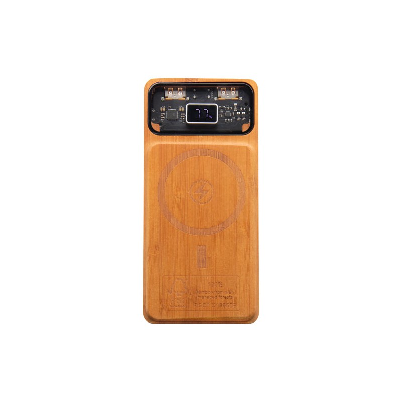 Power bank da 10.000 mAh realizzato al 65% in legno, con logo luminoso e tecnologia MagSafe, per il fissaggio magnetico del power bank al retro dell'iPhone (12 e versioni successive). Il power bank presenta un display digitale e un'uscita/ingresso USB di Tipo C. Viene fornito con un cavo 3 in 1 in PET riciclato (5 V/2 A) con 3 connettori (Tipo-C, Micro USB, iPhone). Se il dispositivo supporta la ricarica wireless ma non la tecnologia MagSafe, è possibile applicare l'adesivo con anello metallico in dotazione sul retro del telefono per renderlo compatibile con il supporto magnetico. Consegnato con confezione regalo in cartone riciclato (18,6 x 10 x 2,6 cm).